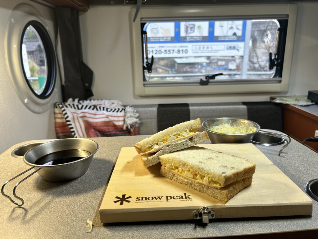 家から作って持ってきたゆで卵を潰して、マヨネーズであえて、パンに挟んだだけ。